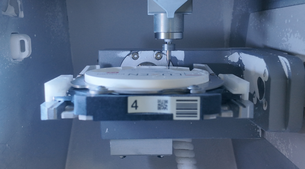 設計されたデータをもとに、機械が材料を削り出すことで歯が作られます。