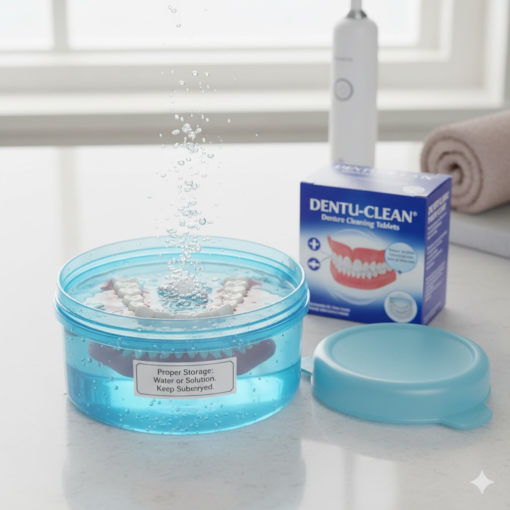 - 変形と乾燥を防ぐ:入れ歯は乾燥に弱く、放置すると変形やひび割れの原因になります。外した入れ歯は、必ず水や入れ歯洗浄剤を溶かした液の入った専用の容器で保管しましょう。